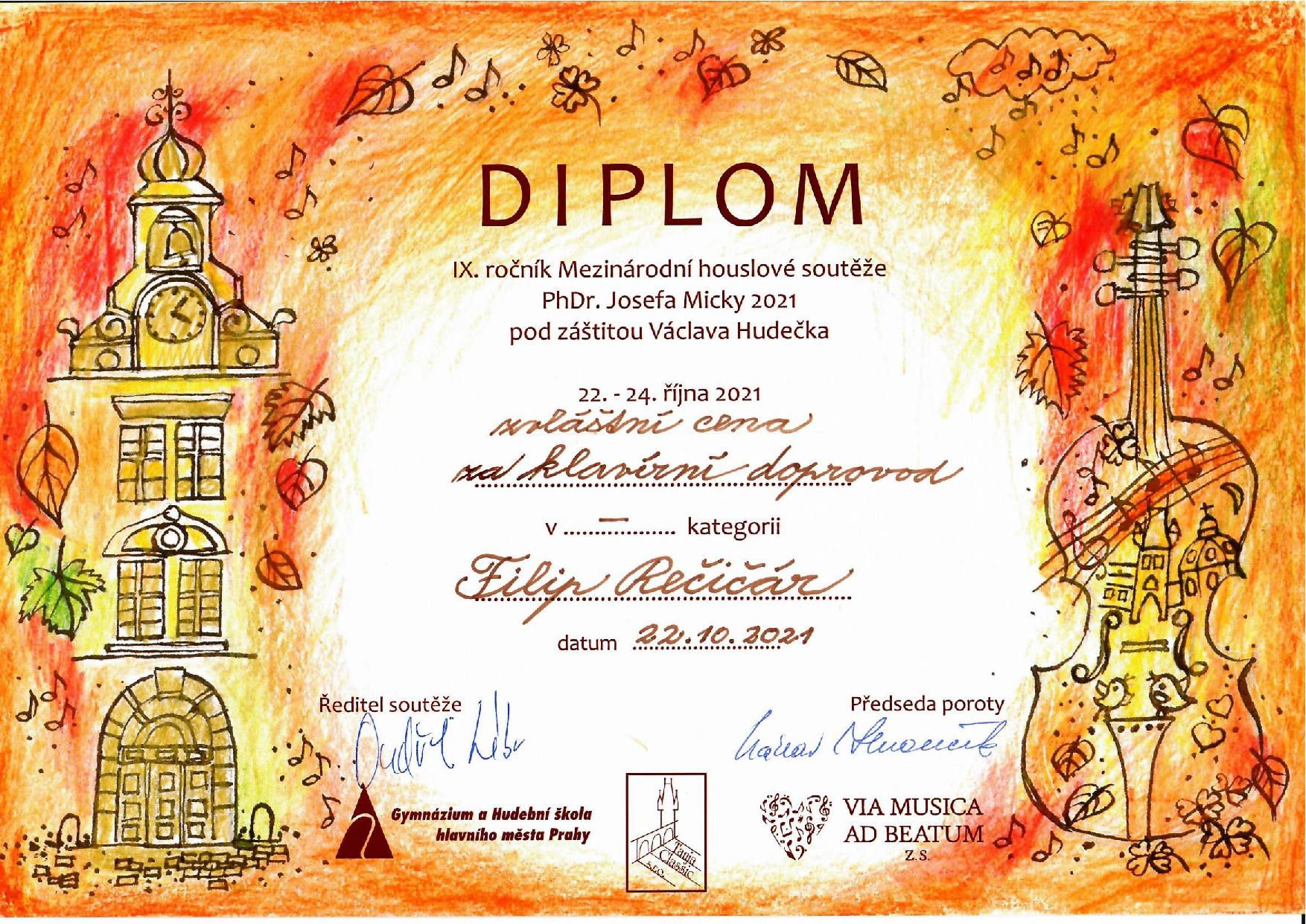 Filip Rečičár ze třídy p. uč.doc. MgA. Elišky Novotné získal Zváštní cenu za klavírní doprovod.