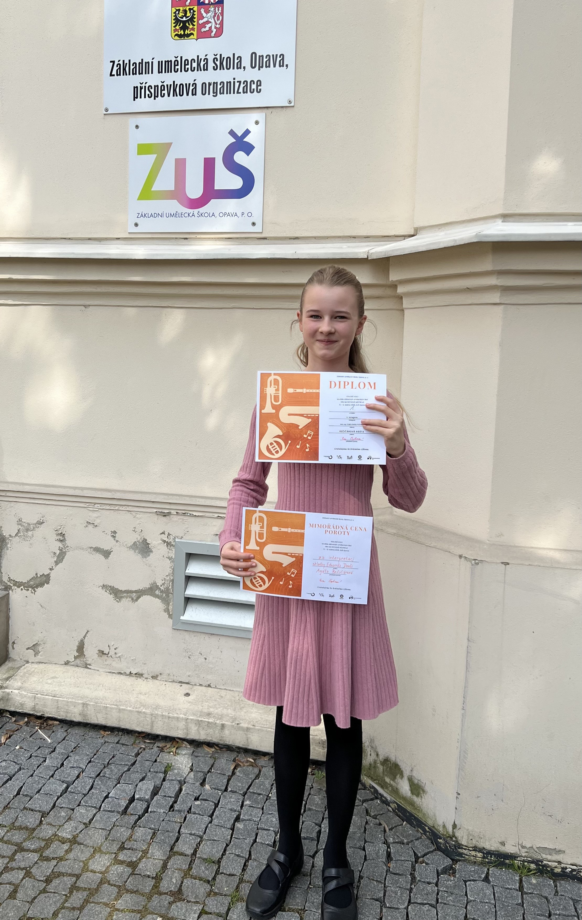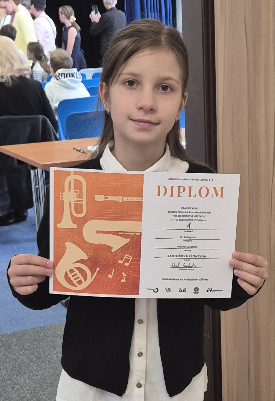 Ve dnech 11. a 12. 5. 2025 se konalo Krajské kolo soutěže dechových nástrojů. Ema Čarná ze třídy paní učitelky Ivany Klegové s klavírním doprovodem Pavly Lichosytové získala 2. místo ve hře na zobcovou flétnu.