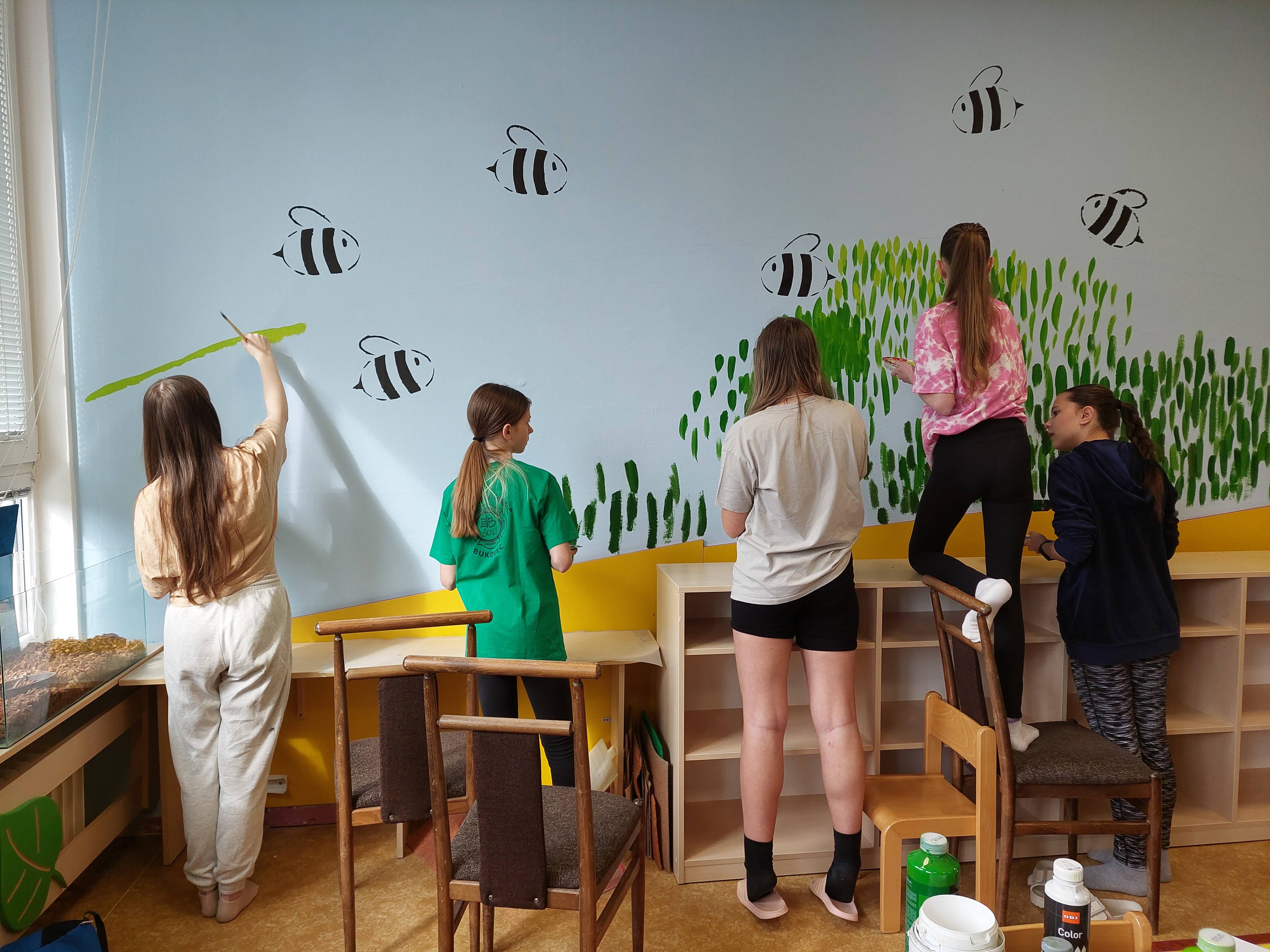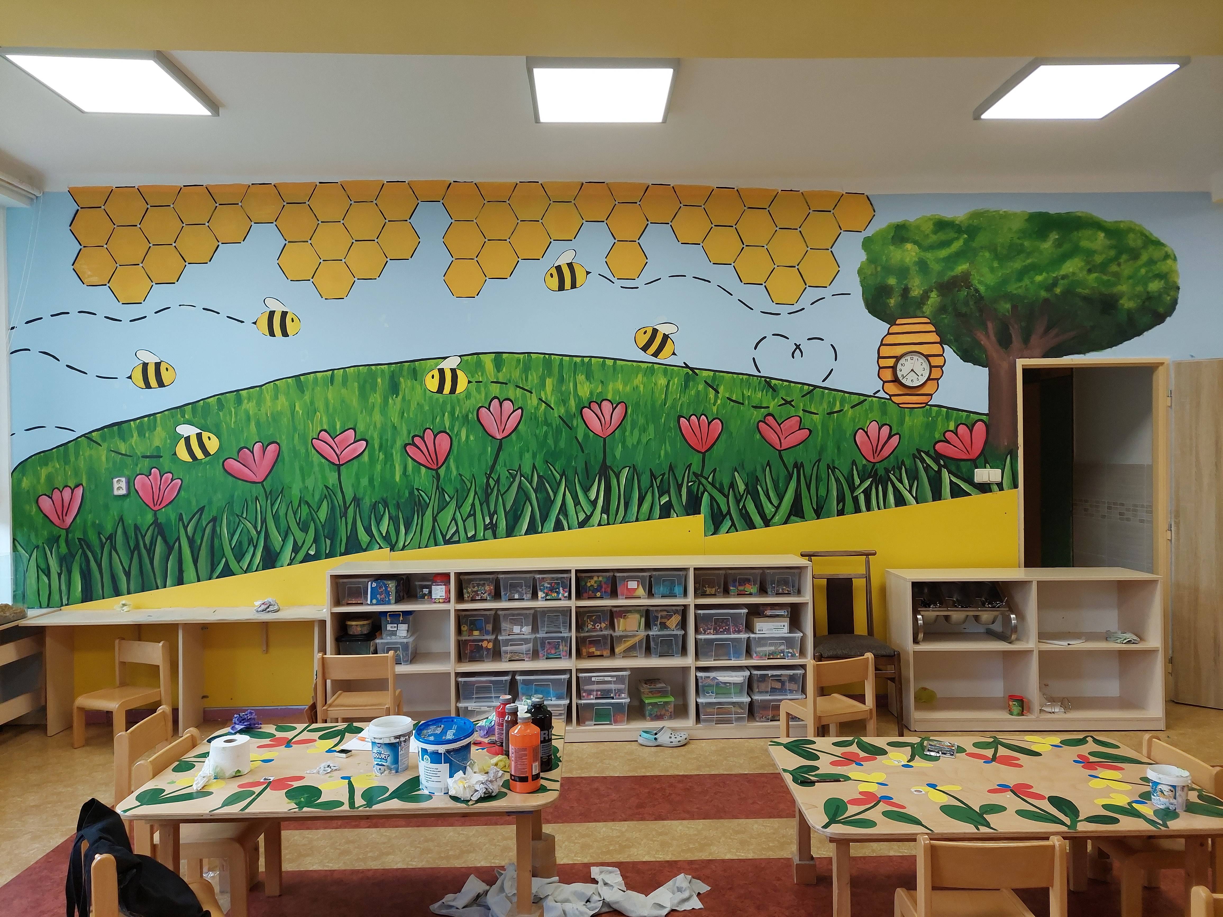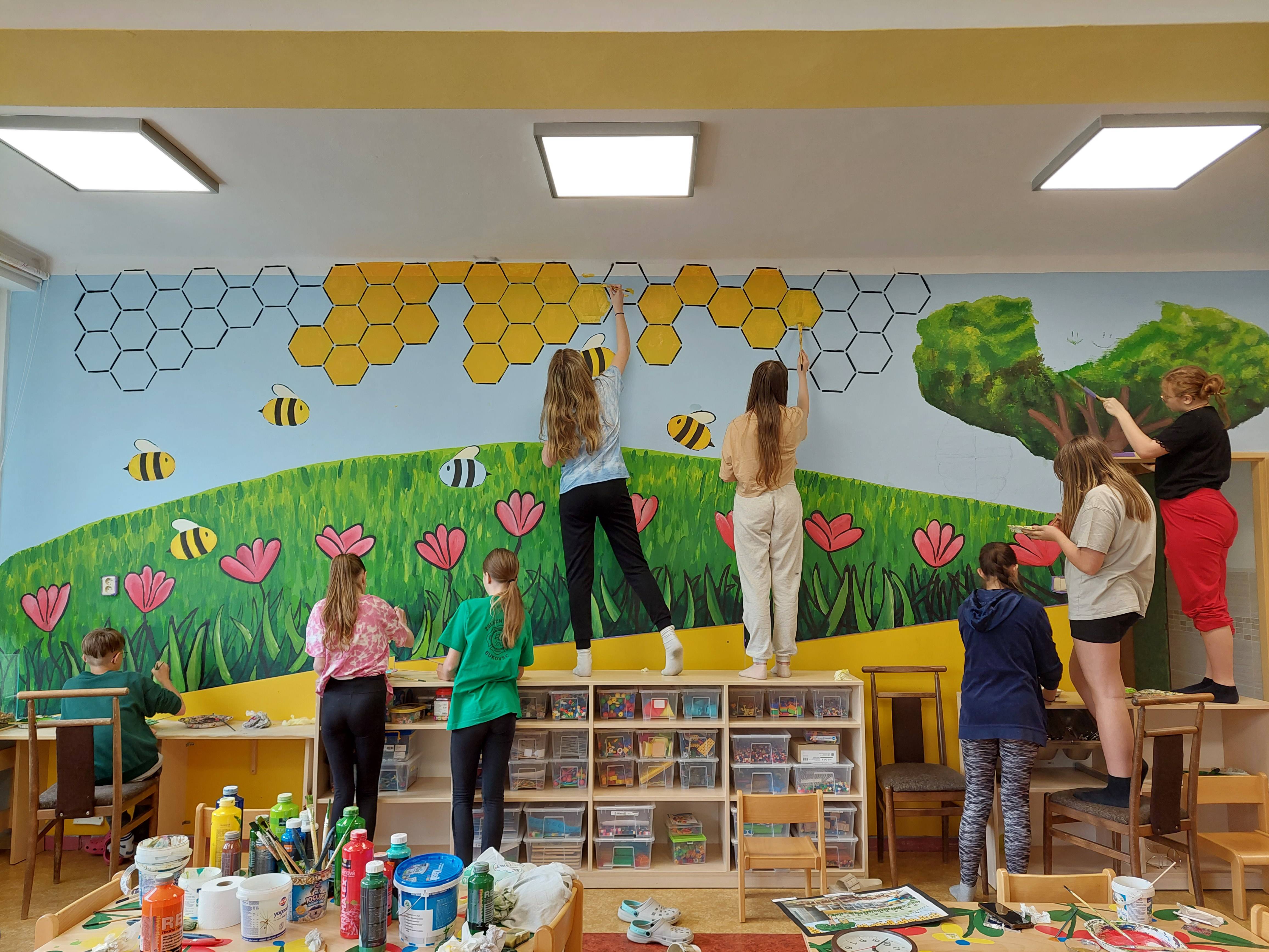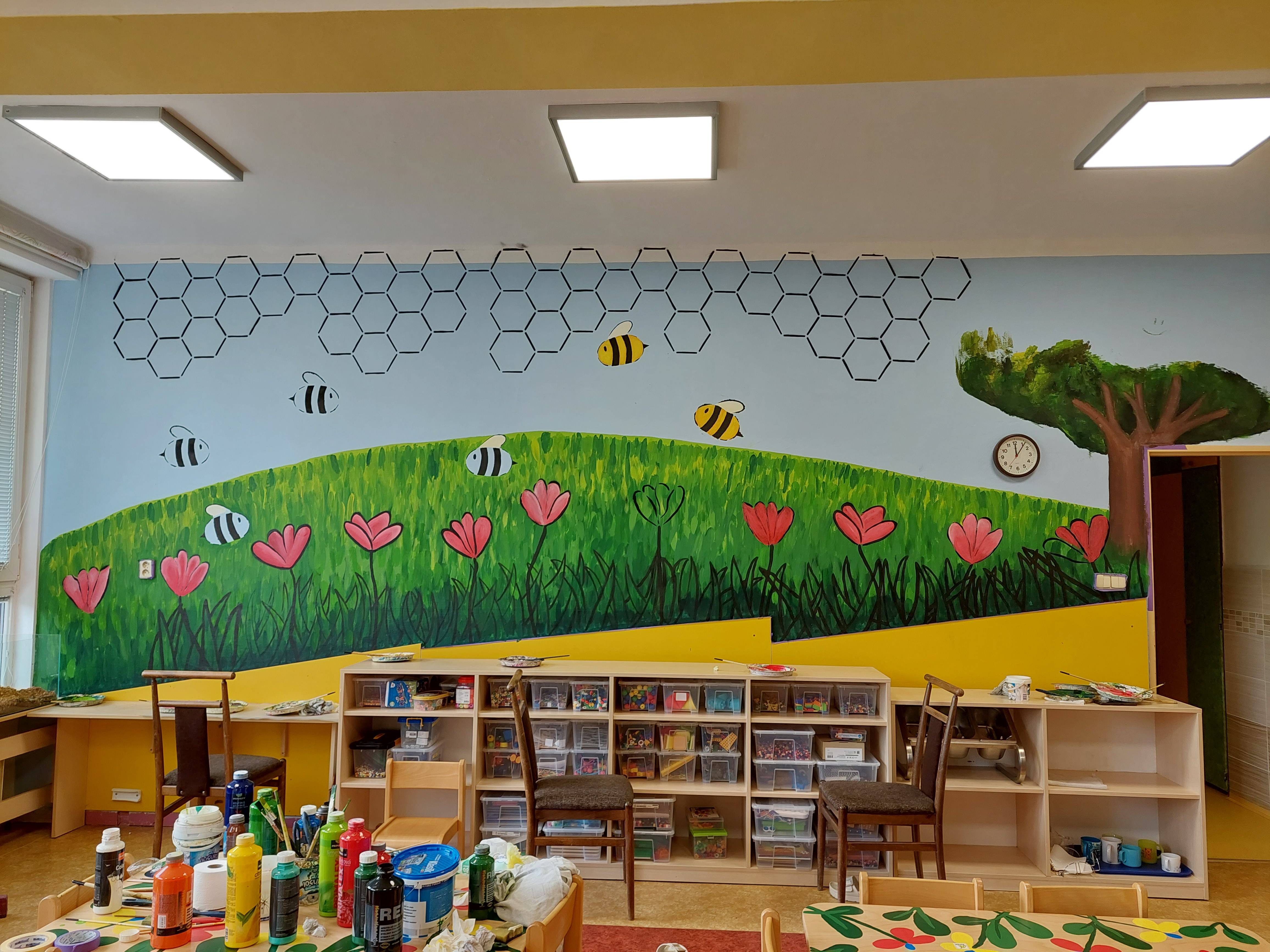 Žáci výtvarného oboru se v tomto školním roce zapojili do projektu výzdoby třídy "Včeliček" pro mateřskou školu Balzacova v Havířově.  Nejprve připravili výtvarné návrhy, z nichž si děti společně s učitelkami vybraly ten, který se jim nejvíce líbil.  Vybraný motiv pak přímo na zeď namalovalo osm našich žáků ze třía krásný výsledek jejich kolektivní práce můžete vidět na fotografiích.  Děkujeme školce za milé přijetí a skvělou spolupráci!