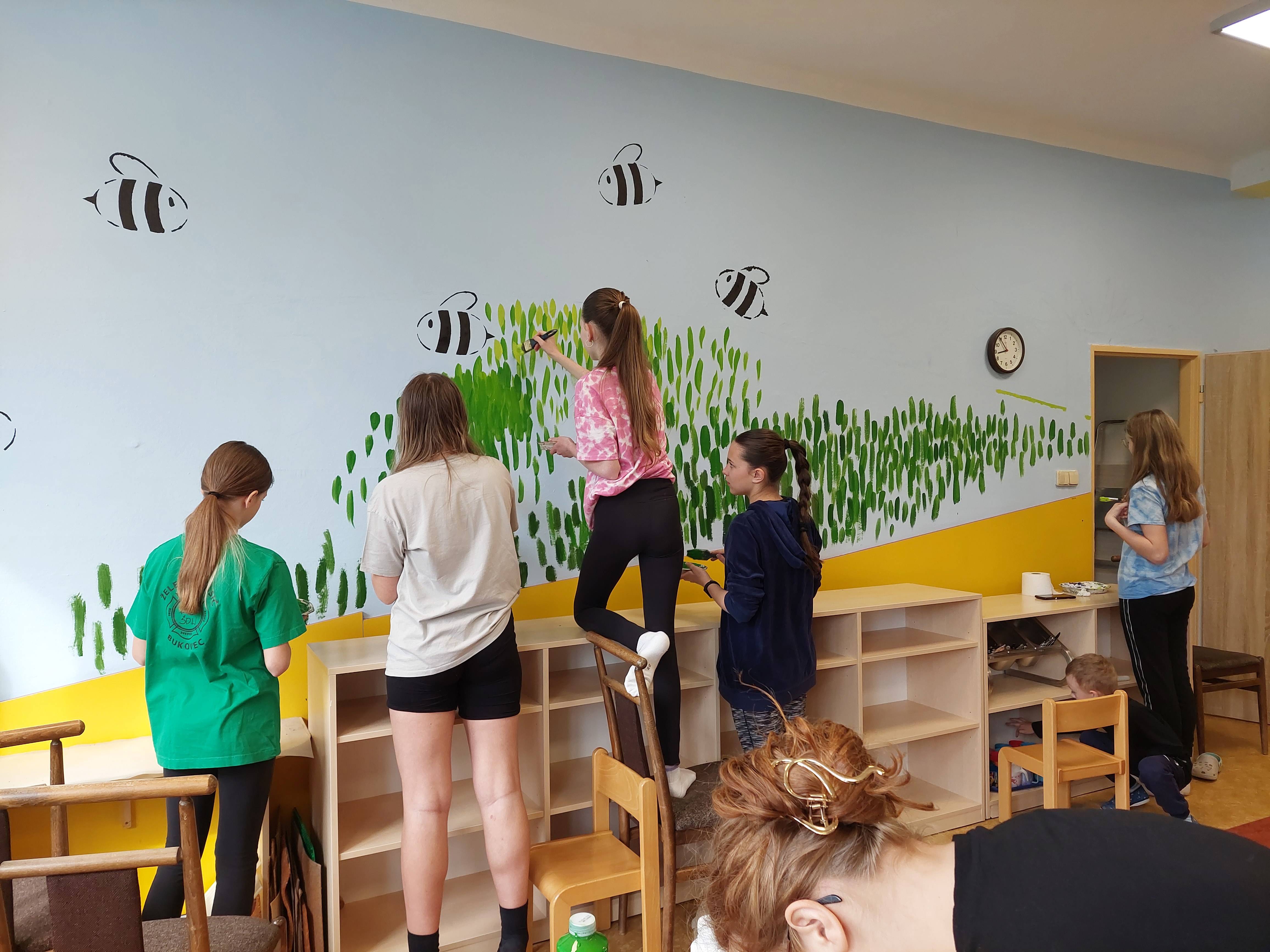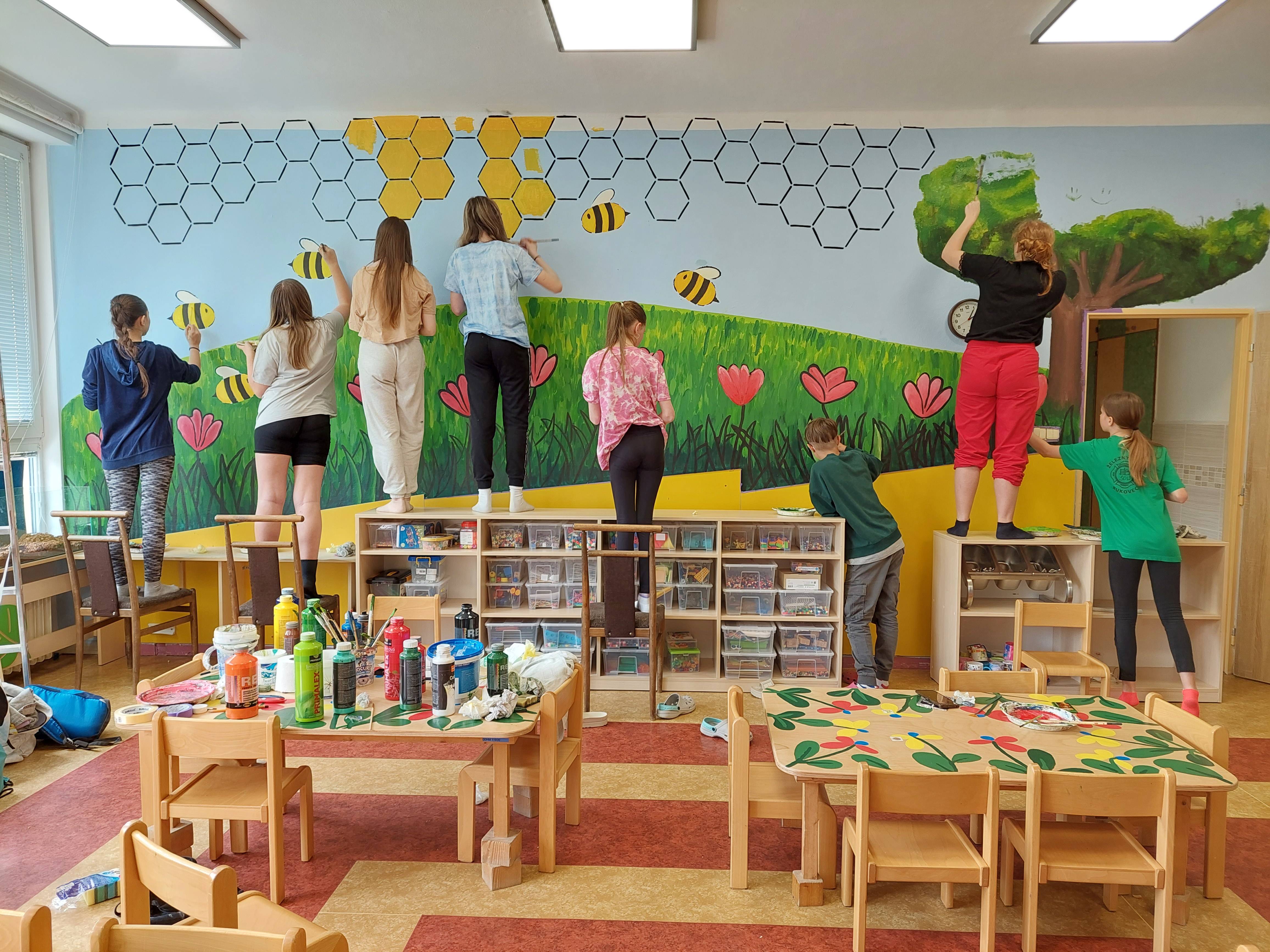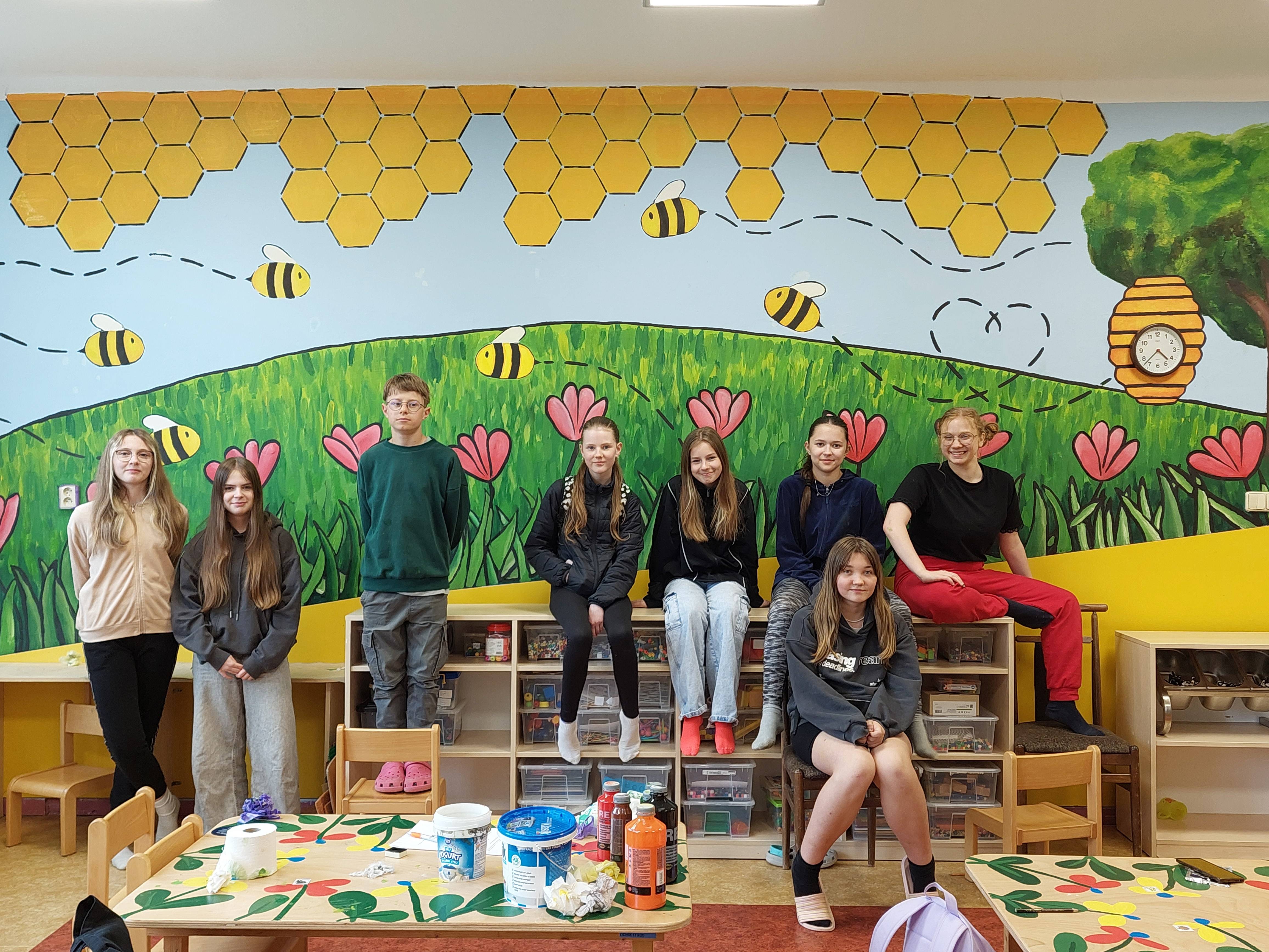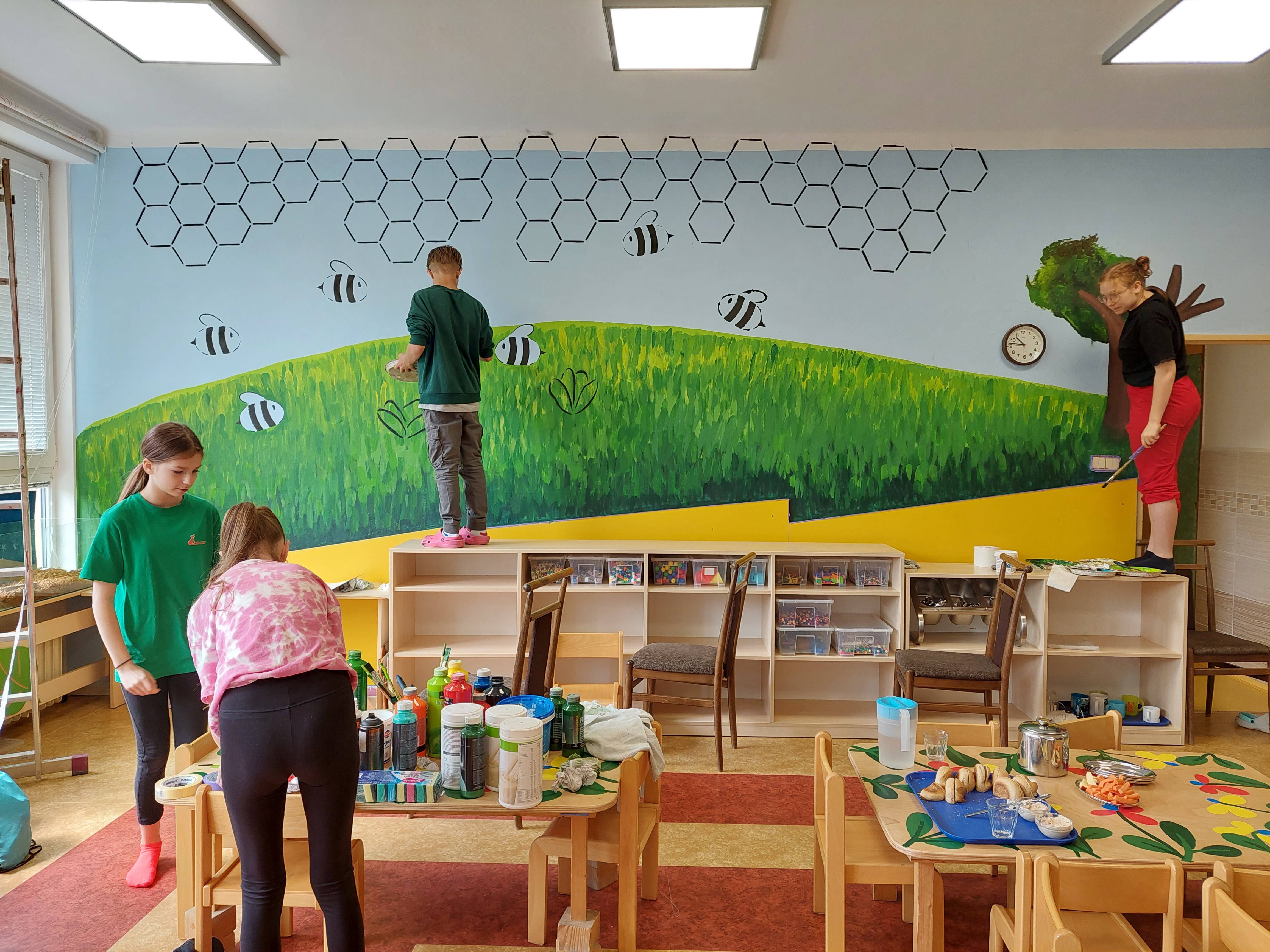 Žáci výtvarného oboru se v tomto školním roce zapojili do projektu výzdoby třídy "Včeliček" pro mateřskou školu Balzacova v Havířově.  Nejprve připravili výtvarné návrhy, z nichž si děti společně s učitelkami vybraly ten, který se jim nejvíce líbil.  Vybraný motiv pak přímo na zeď namalovalo osm našich žáků ze třía krásný výsledek jejich kolektivní práce můžete vidět na fotografiích.  Děkujeme školce za milé přijetí a skvělou spolupráci!