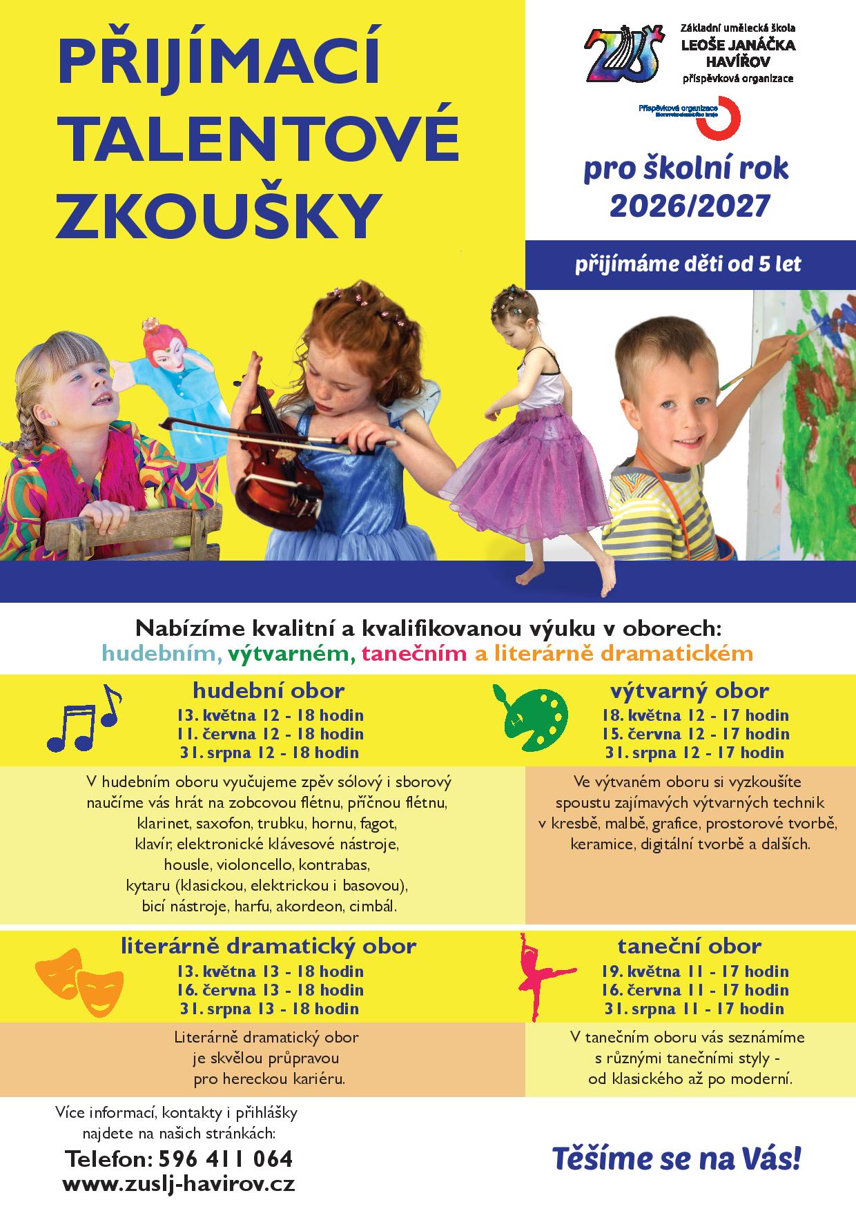 přijati do ZUŠ. Žáci jsou přijímáni do přípravného studia I. stupně (5–6 let), studia I. stupně od 7 let,