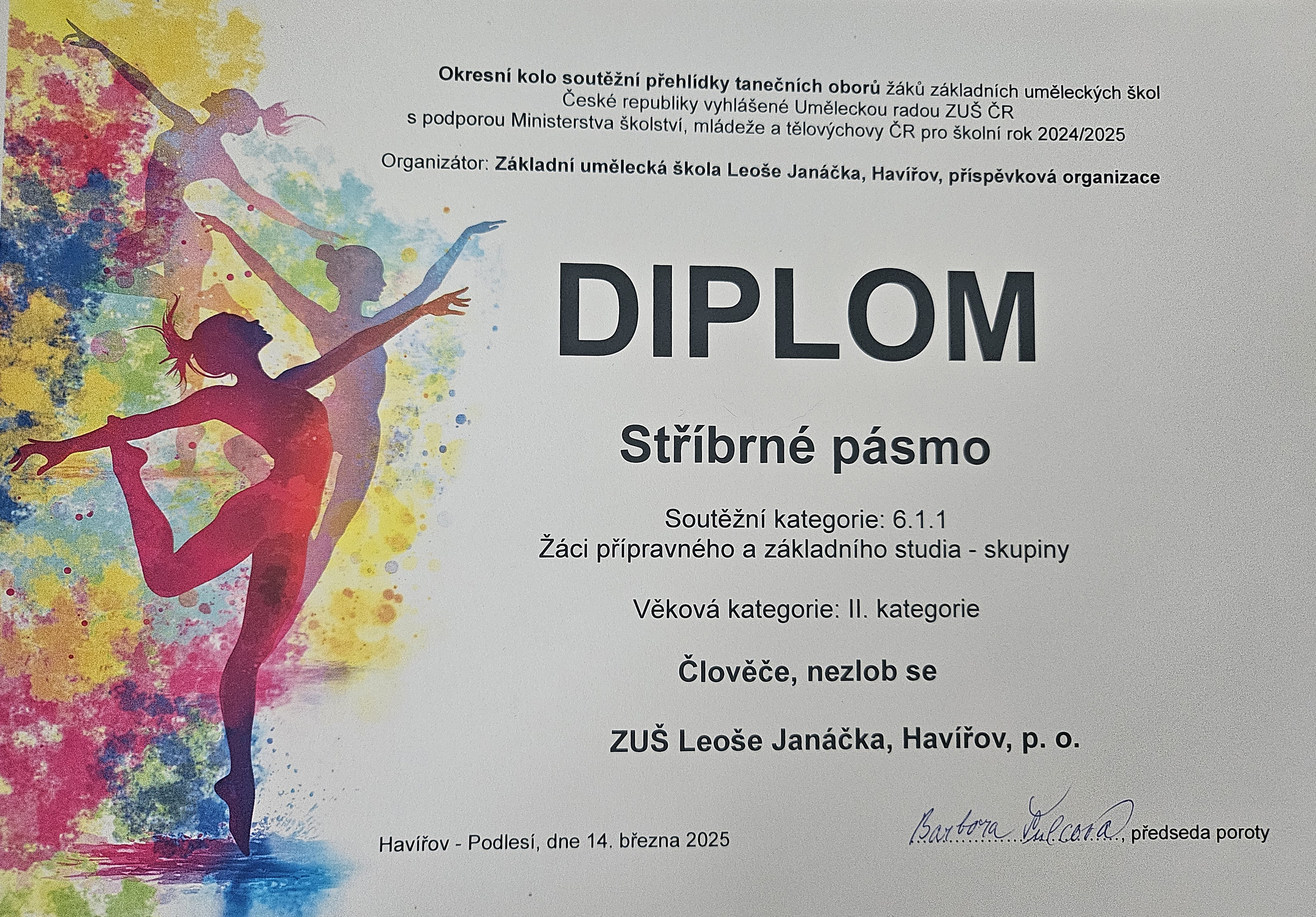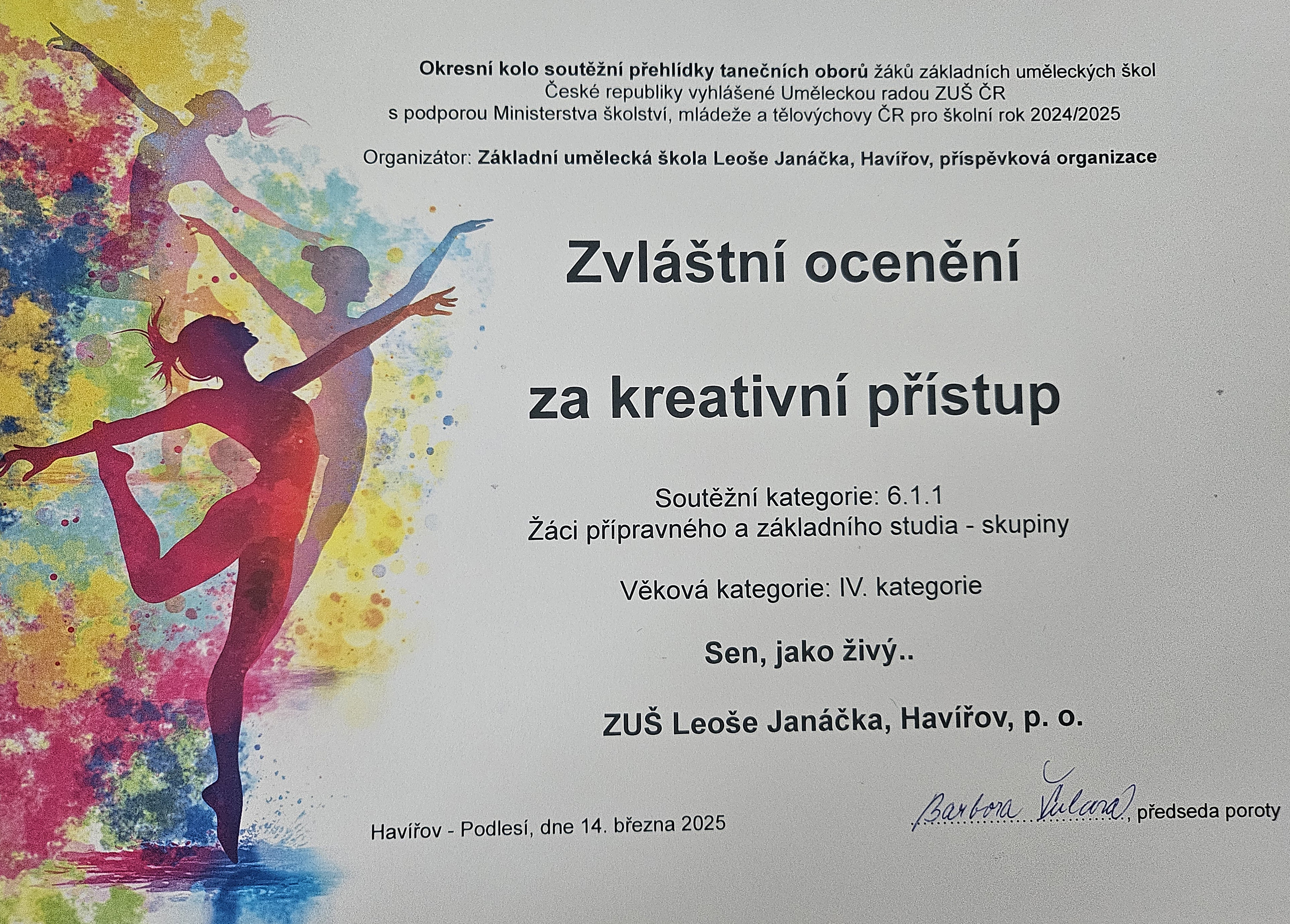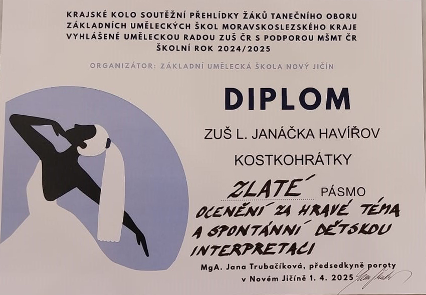 Dne 1.4. 2025 se v Novém Jičíně konalo Krajské kolo soutěžní přehlídky Tanečního oboru ZUŠ Moravskoslezského kraje. Naše nejmenší tanečnice pod vedením p. uč. MgA. Karin Ulrichové získaly s choreografií "Kostkohrátky" krásné 1. místo a "Ocenění za hravé téma a spontánní dětskou interpretaci"