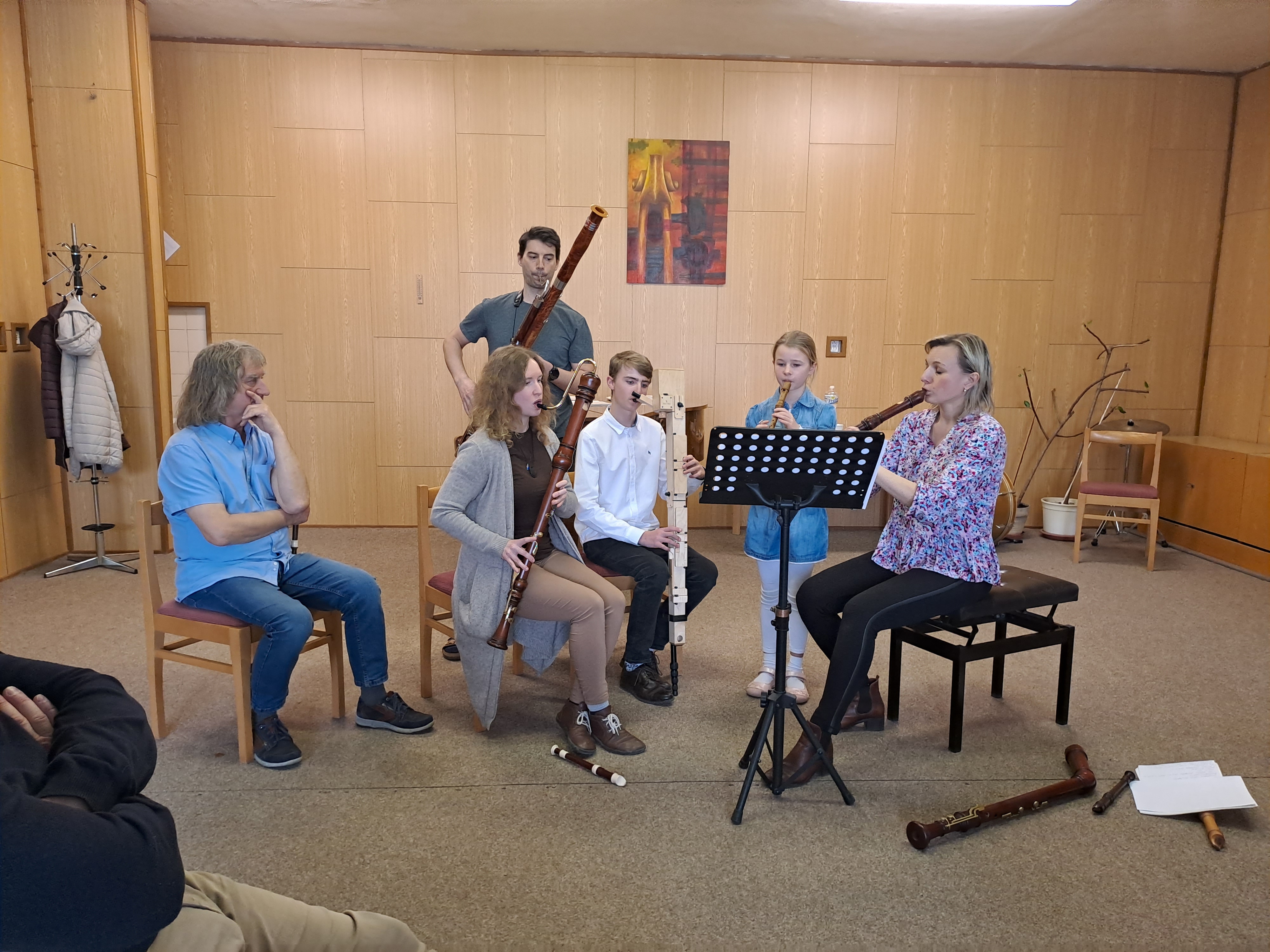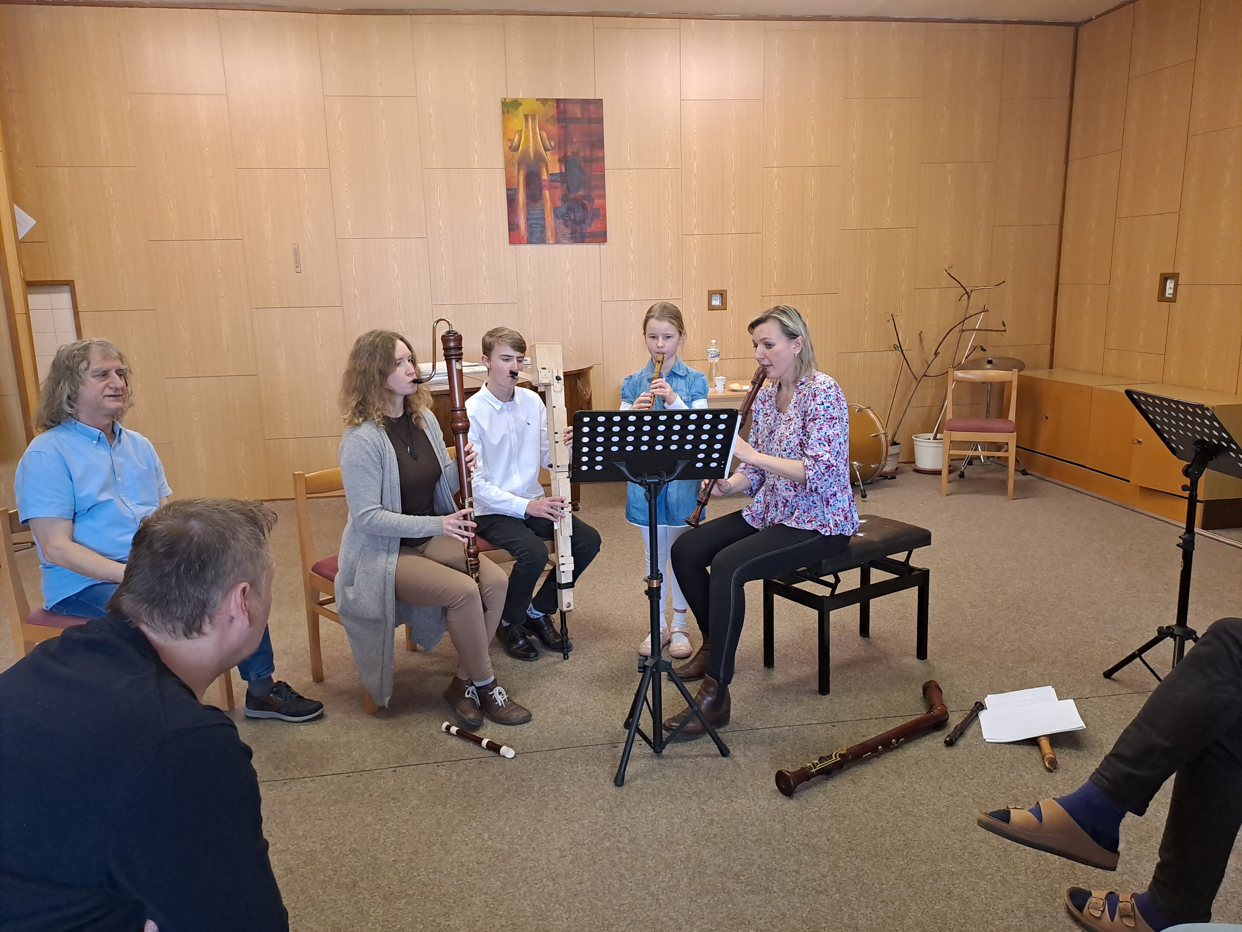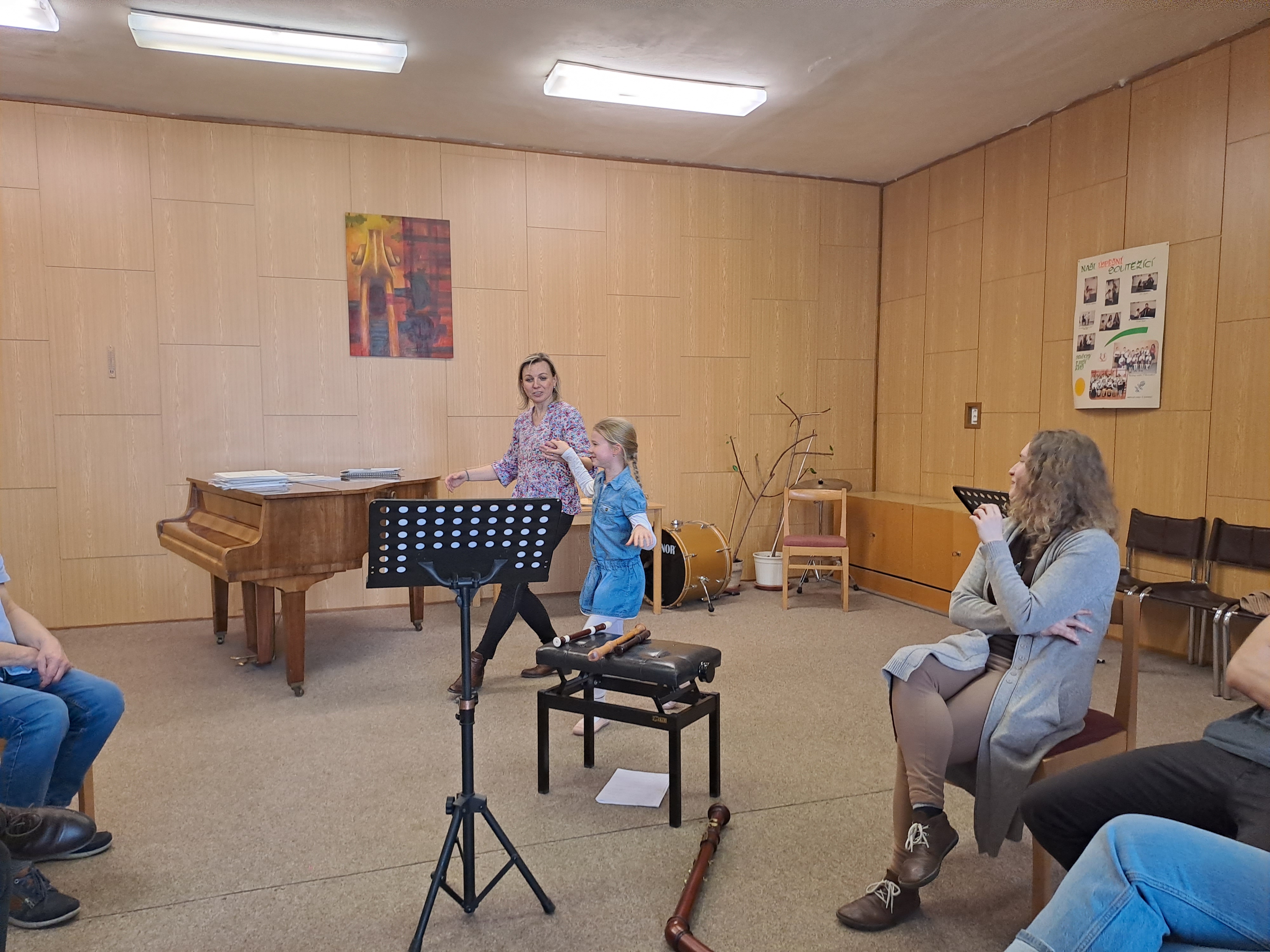 Pro žáky a učitele hry na zobcové flétny připravila kouzelné dopoledne. Do souborové hry se úspěšně zapojili všichni přítomní včetně Agáty a Filipa Rečičárových (tř. uč. Karolína Wilková a Jarmila Paclová), kteří byli z řad žáků vybráni pro účely workshopu. S Agátkou předvedla paní Konečná ukázkovou lekci. Všechny zúčastněné vtáhla do nenásilné hry s moderními technikami. Filipovi zapůjčila svou úžasnou basovou flétnu ,,Paetzold" k vyzkoušení. Ten se ihned s velkým nadšením začlenil do ansámblové hry.